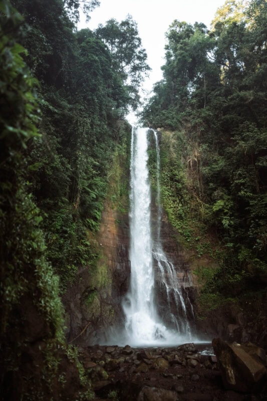 Op zo’n 30 minuten rijden van Lovina ligt de 35 meter hoge Gitgit Waterfall die ook zeker thuishoort op dit lijstje met mooiste watervallen op Bali. Het water stort hier met een indrukwekkende kracht naar beneden, waardoor er een constante nevel in de lucht hangt die op warme dagen heerlijk verkoelend aanvoelt. Gitgit Waterfall is makkelijk bereikbaar en je hoeft er geen zware hike voor te maken. Vanaf de parkeerplaats wandel je in ongeveer tien minuten over een goed aangelegd pad richting de waterval. Onderweg kom je langs een aantal kleine kraampjes waar vriendelijke lokale verkopers handgemaakte souvenirs, snacks en drankjes aanbieden. Dat verklapt meteen dat je deze plek waarschijnlijk niet voor jezelf hebt. Wil je de drukte voor zijn, dan is het slim om vroeg in de ochtend te gaan. Lees al onze tips voor Lovina.