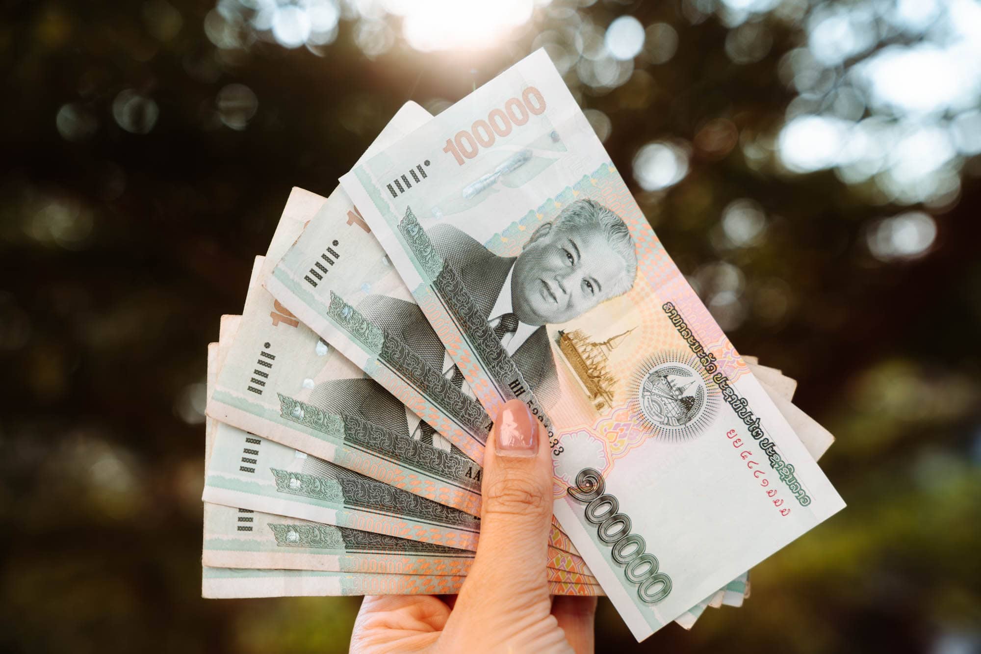 Munteenheid in Laos: In Laos betaal je met de Laotiaanse kip (LAK). Door de lage waarde van de munt loop je al snel rond met een flinke stapel briefgeld.