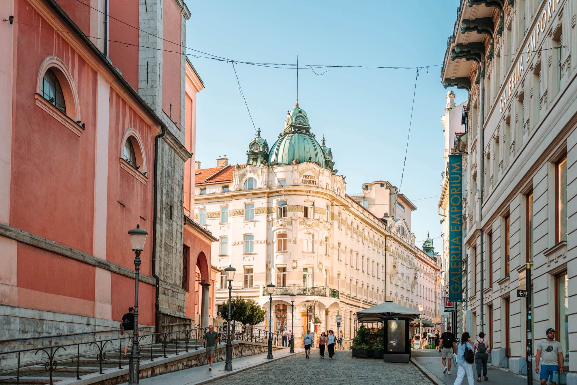 Op het centrale Prešerenplein valt direct één gebouw op: het Franciscanenklooster met zijn opvallende roze gevel. Het klooster bestaat al sinds 1233 en ademt historie. Binnen vind je een prachtig interieur met kleurrijke fresco’s, marmeren details en een indrukwekkende bibliotheek vol eeuwenoude manuscripten. Het klooster ligt pal naast de iconische Tromostovje brug en is daardoor niet te missen. Waar het plein bruist van terrasjes en drukte, stap je hier een bijna serene wereld binnen.