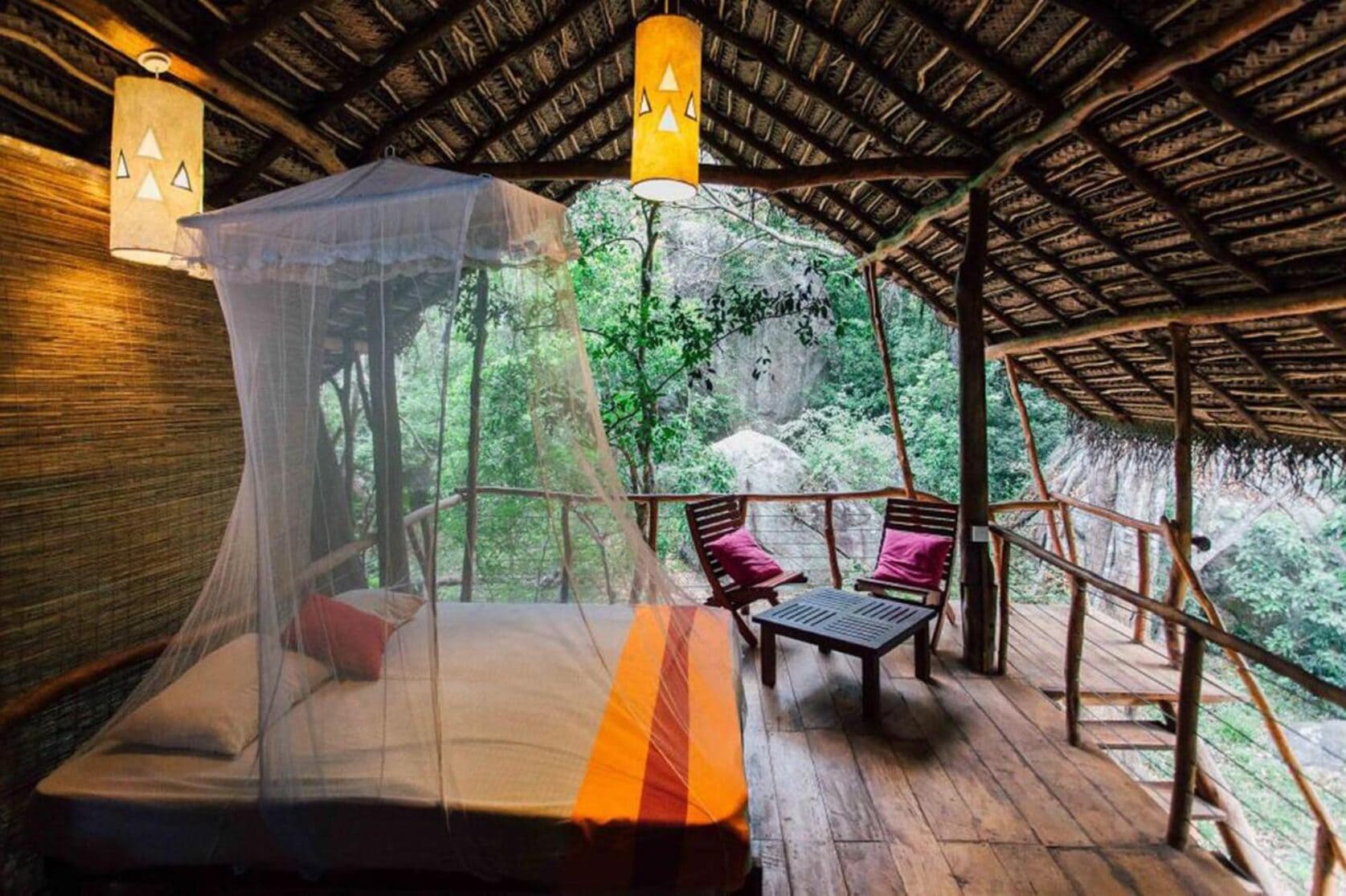 Een overnachting in een boomhut, daar droomt toch iedereen van? We beginnen deze lijst dan ook goed met een zeer avontuurlijke overnachting in Sigiriya, waar deze boomhut jouw tijdelijke thuis kan zijn. Je hebt géén deur en géén muren, wel een dak en een klamboe. Het is een ware belevenis om zo goed als buiten te slapen want hier val je in slaap met de geluiden van de natuur. En geen zorgen: hier overnachten is hartstikke comfortabel. De boomhut van Back of Beyond is namelijk van alle gemakken voorzien.